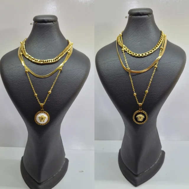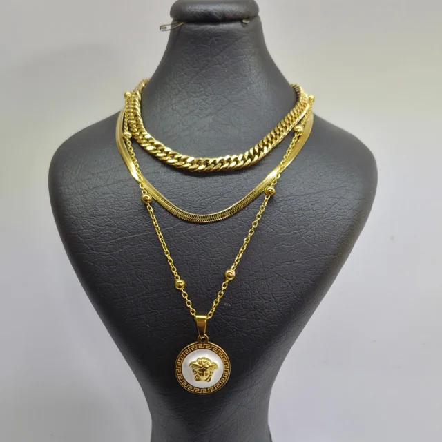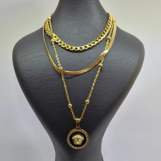 گردنبند ۳ لاین ورساچ شامل: زنجیر کارتیر ، زنجیر ماری ، زنجیر البرنادو به همراه پلاک ورساچ موجود در دو رنگ پلاک فول استیل ضد حساسیت رنگ ثابت کیفیت بالا و درجه یک کار وارداتی و با کیفیت✨ مناسب استفاده دائم ارسال به تمام نقاط ایران